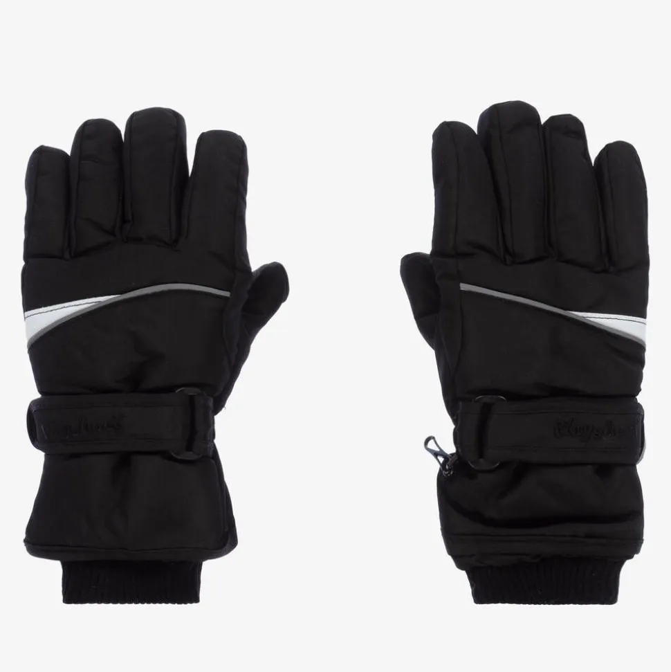 Black ski gloves for boys and girls by Playshoes, with reflective trims. Warm but lightweight with 3M Thinsulate⢠insulation, they are waterproof and breathable. Lined in soft, warm fleece, they have comfortable ribbed cuff, adjustable velcro straps and hard-wearing, slip-resistant palms.