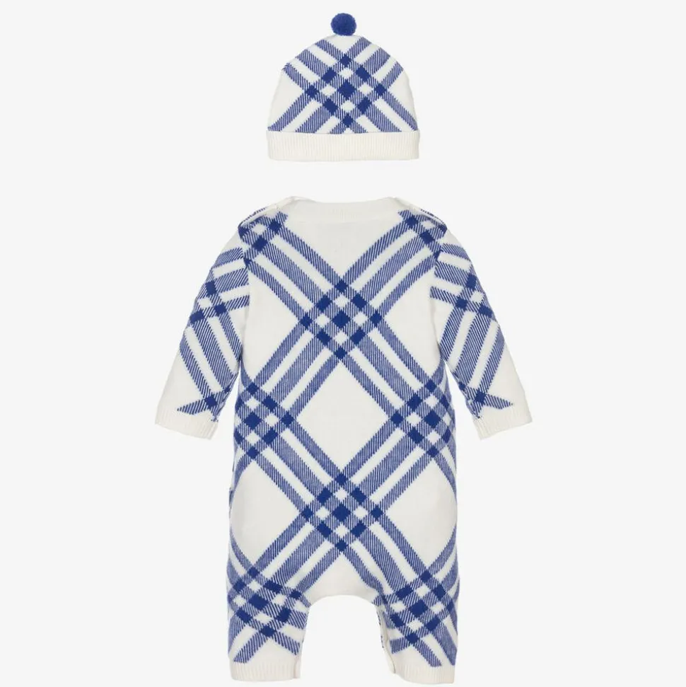 A striking look for baby boys and girls, this ivory romper and hat set from Burberry is patterned in the British brand's Knight blue bias check. Super cute and cosy, both pieces are knitted in a luxurious wool and cashmere blend with a soft brushed feel. The romper has button fastenings on the shoulder and between the legs and the hat has an adorable blue pom-pom detail. An ideal gift, both pieces come presented in a box.