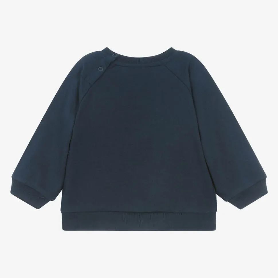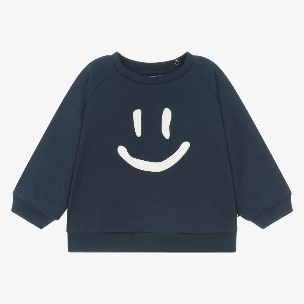 Cute navy blue sweatshirt for little boys and girls by Danish brand Molo, with a smiling face printed on the front. Casual and comfortable, it is made in soft organic cotton jersey with a cosy fleecy inside and popper fastenings on the back of the raglan sleeve. A small logo tab on the side seam adds a designer finishing touch.