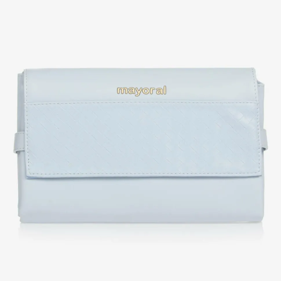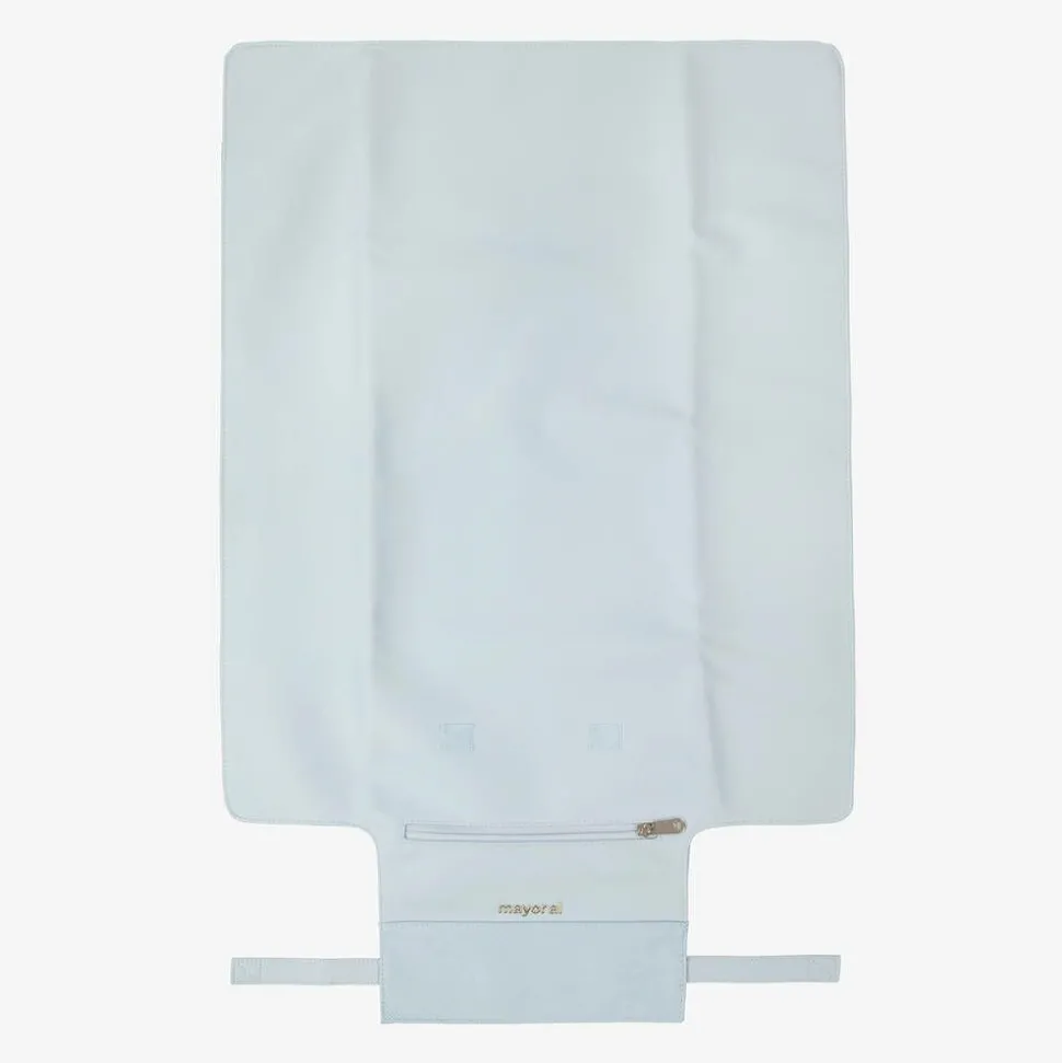 Lovely pale blue foldable changing mat for baby boys and girls by Mayoral. Fastening with velcro on both sides, it is made in soft faux leather with a silky lining and light padding for baby's comfort. Lightweight and practical on the go, it folds up easily into a compact size to slip into a buggy pocket or a changing bag and has a zipped back for pocket. The front flap has an embossed weave pattern and a golden logo branding.