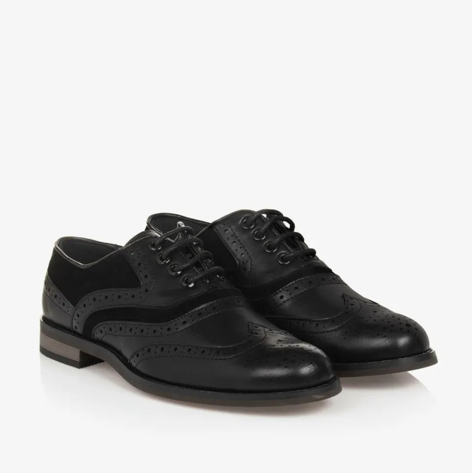 Smart and stylish, these black Mini-me brogues for boys are by House of Cavani. Made and lined in smooth faux leather, they have faux suede trims and perforated detailing for a classic look. With lightly padded insoles, these lace-up shoes have slim rubber outsoles for a sleek finish.