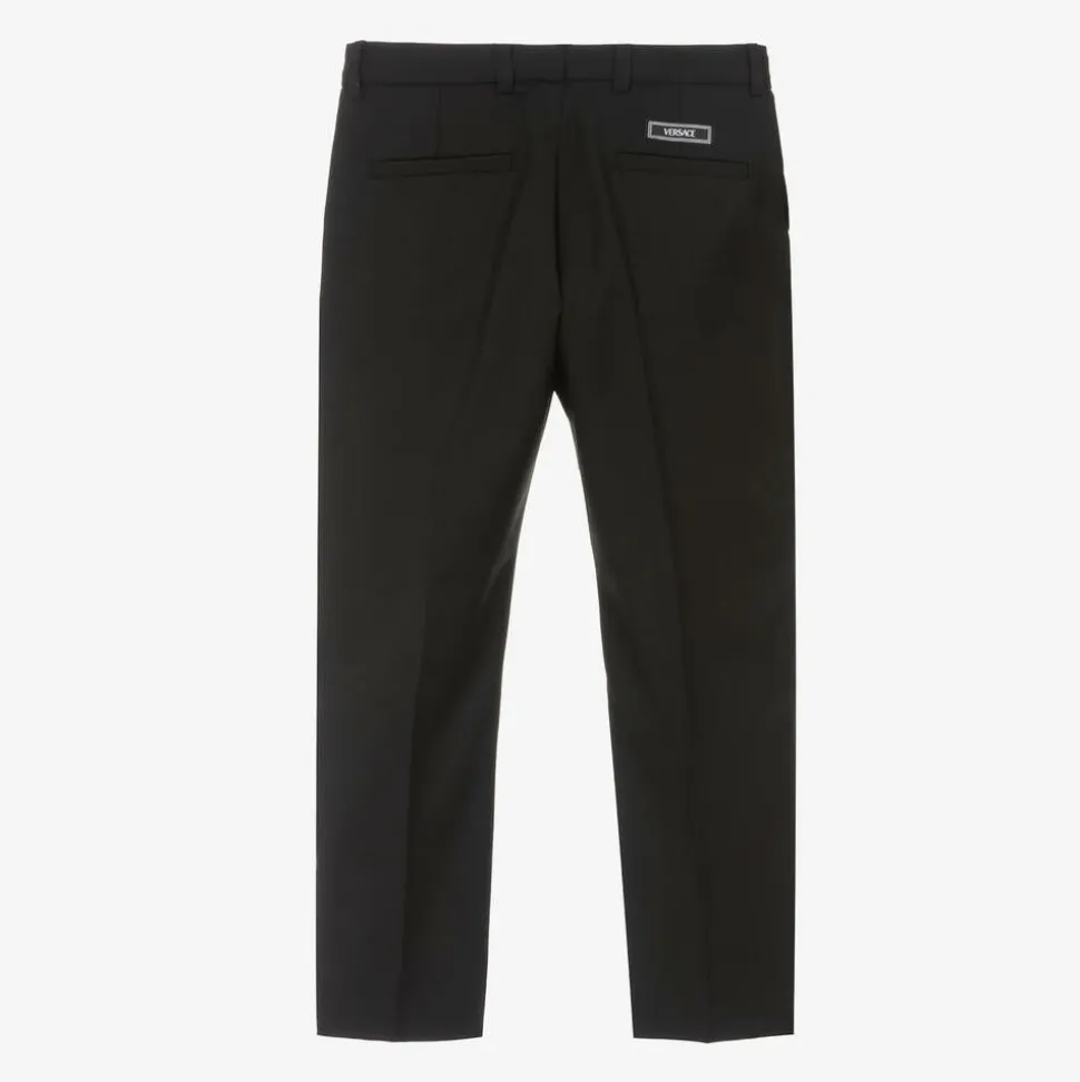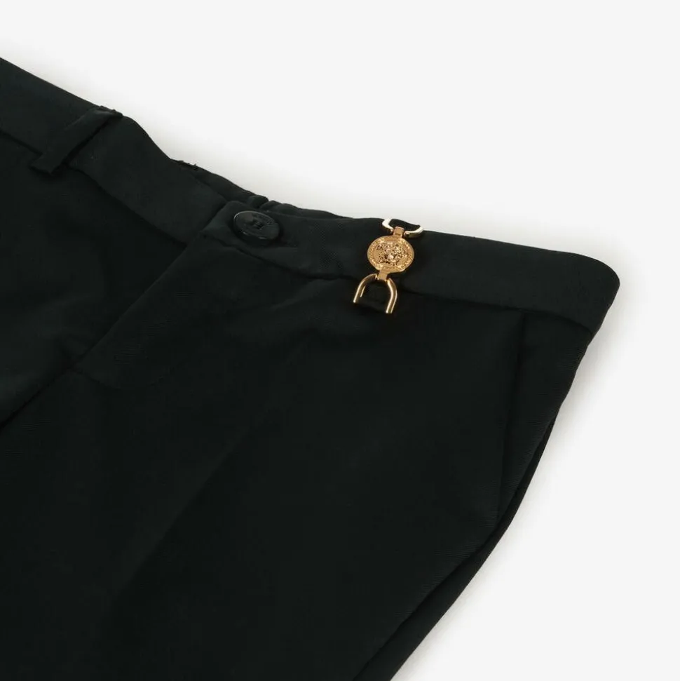 Black trousers for boys by luxury Italian label Versace, made in a soft, lightweight wool blend twill. This smart design has slanted front pockets, welt back pockets and useful belt loops featuring gold-tone Medusa '95 hardware for instant appeal. There is a branded tab on the back and they fasten neatly with a button and zip.