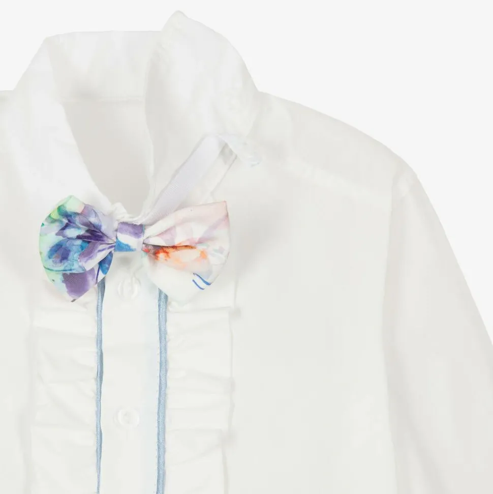 A charming blue suit for little boys by Andreeatex. Made from soft velour with a lightweight cotton lining, the pale blue blazer has a smart revere collar, a faux pocket square pocket on the chest, faux flap pockets on the waist, and crest-style button fastenings on the front. The white button-up long-sleeved shirt has frilled trims, blue piping, and a colourful bowtie that fastens with poppers under the smart pointed collar. Made from smooth twill, the lightly lined trousers have a silky blue buttoned cummerbund decoration on the front and a comfortable elasticated waistband.
