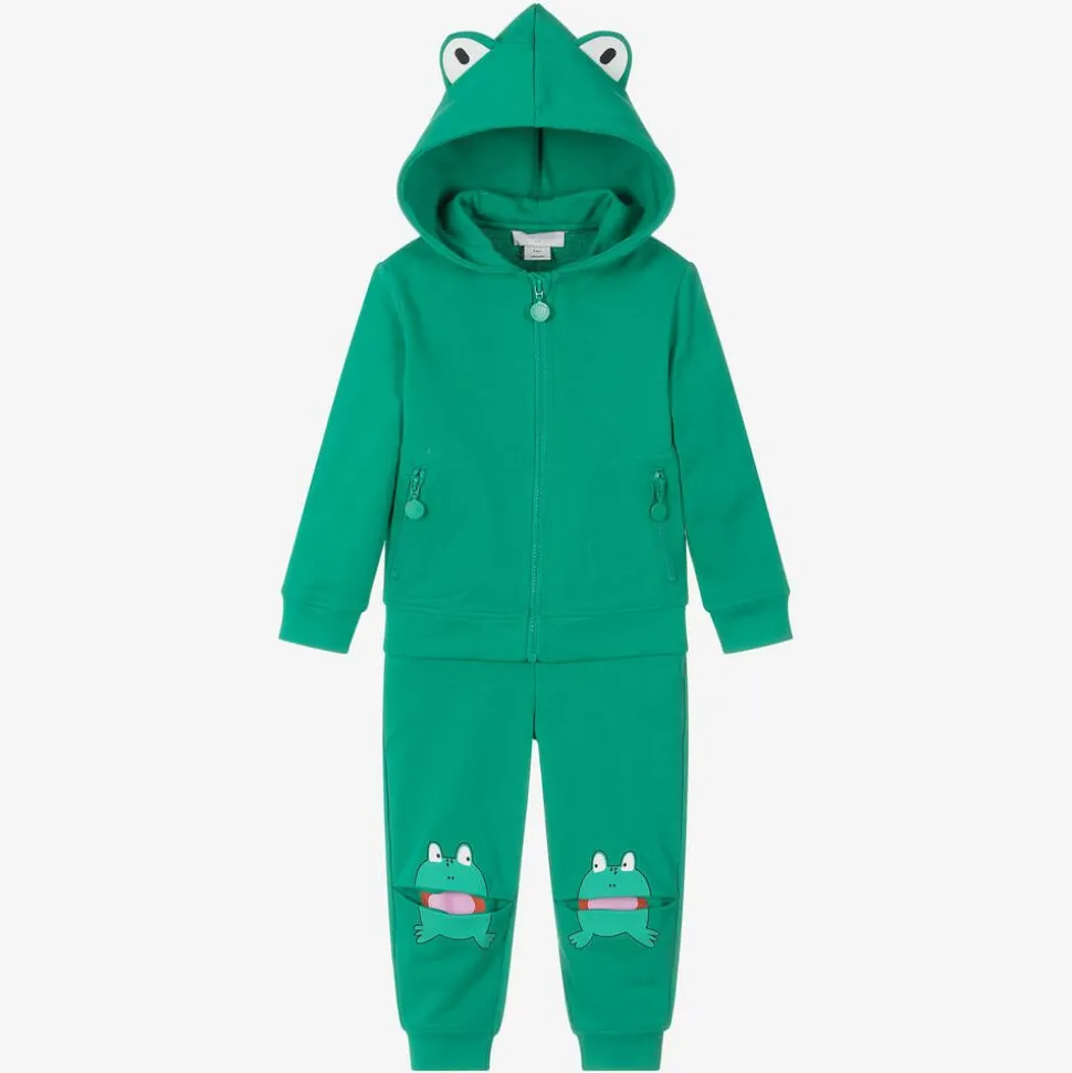 Super cute green cotton tracksuit for boys by Stella McCartney. It has fun 3D frog ears on the hood and frogs printed on the knees, with opening mouths in the inverted pleats. Made in soft, lightweight, sweatshirt jersey, there are zipped pockets on the jacket and concealed side seam pockets on the joggers.