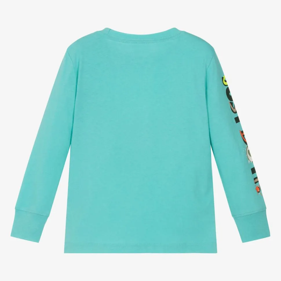 A turquoise green long-sleeved T-shirt for boys by Nike, made in a soft and comfortable cotton blend jersey. This cool top has the American brand's 'Just Do It' slogan in a colourful graphic on one sleeve and the Swoosh logo with fun paint splatters on the chest.