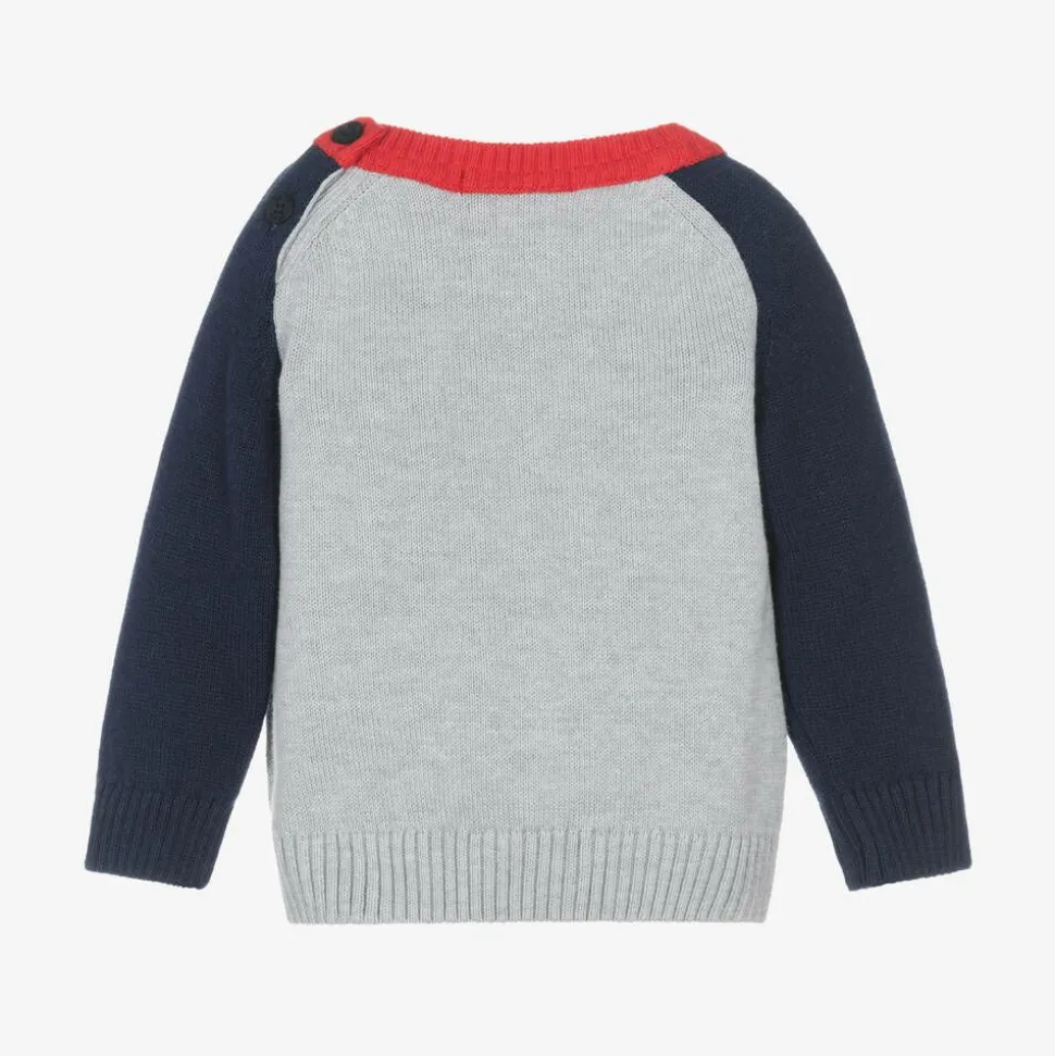 Circus-themed grey sweater for younger boys by Portuguese brand Dr. Kid, knitted in a soft blend of cotton and wool. This cosy top has navy blue long sleeves and a red crew neck. There is a fun intarsia knit ringmaster on the front with fluffy hair, embroidery detailing and a ticket appliqué popping out of his top hat. To help with dressing, smaller sizes have button fastenings on one shoulder.