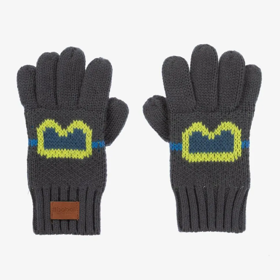 Dark grey knitted gloves for boys by Boboli, with a fun ski-goggle design in blue and lime green. Made in a soft cotton, viscose and wool blend, they have ribbed cuffs with a faux leather logo tab on one side.