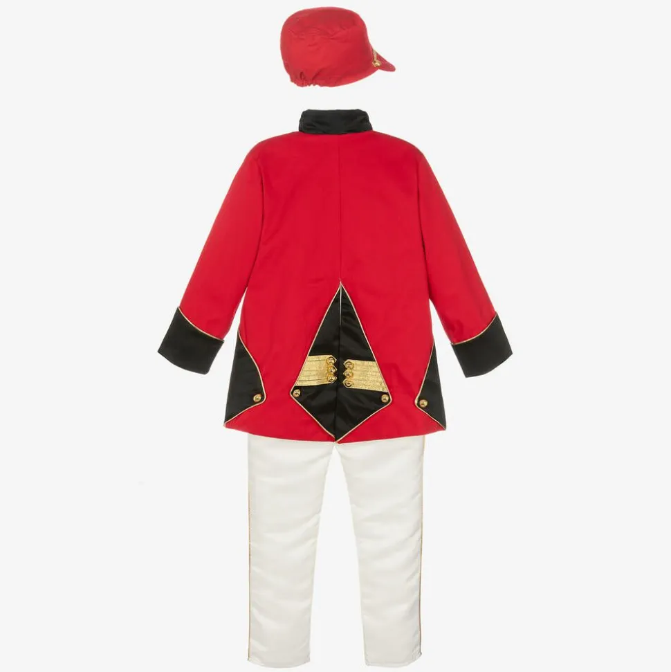 Ideal for special occasions, a red and white military-style suit for younger boys by Andreeatex. With a lightweight lining, the long-line jacket has ornate gold trims, decorative gold buttons and a stand-up collar. It fastens with concealed buttons and popper on the front. The white satin trousers are lined in soft cotton and have an adjustable, elasticated waistband. There is a gold trim down each leg and a red panel on the front for a coordinated look. A classically styled long-sleeved shirt, along with a matching red hat completes this smart outfit.