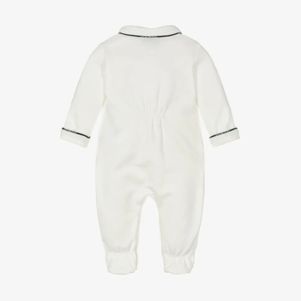 A lovely off-whte babygrow for boys by Italian brand Emporio Armani, made in comfortable cotton jersey. The edges have black trims, printed with a small repeat logo for a subtle designer touch. It has a cosy brushed feel on the inside, with branded popper fastenings on the front and between the legs to help with dressing.