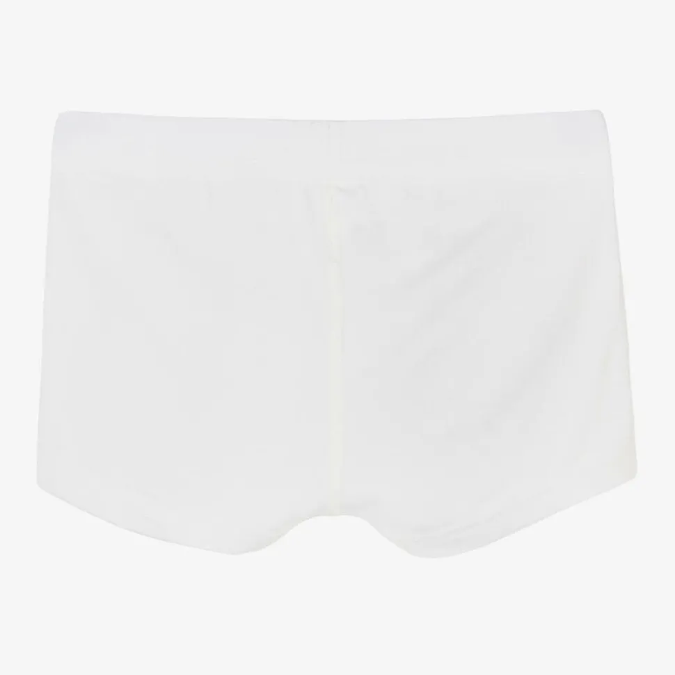 White thermal boxer shorts for boys by Joha, made from a luxurious organic viscose bamboo jersey. They have a comfortable elasticated waistband, with a striped rainbow logo tab on the front.