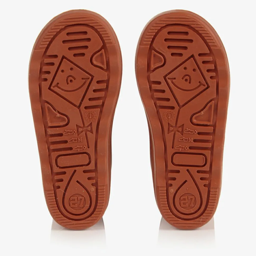 Brown thermal rain boots for boys and girls by Danish brand EN FANT, in super flexible eco-friendly rubber. They have a seamless waterproof exterior to keep their feet dry and a reflective logo on the side for high visibility. Warm down to -30*C, they are lined in plush wool with an aluminium membrane for added insulation. They have a good grip on wet and icy surfaces thanks to the non-slip sole.