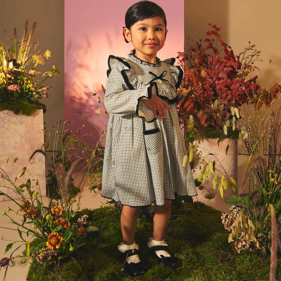 Black gingham dress for girls by Foque, made in cosy, mid-weight cotton and viscose. Patterned with lovely check, this classic dress has black velvet detailing, fluted sleeves, and ruffled edges. The bodice is signed with a discreet pearlescent logo charm attached to a decorative bow. The stand-up frill neckline adds elegance and the zip on the back is hidden for neatness. The cotton-mix lining completes the style with comfort.