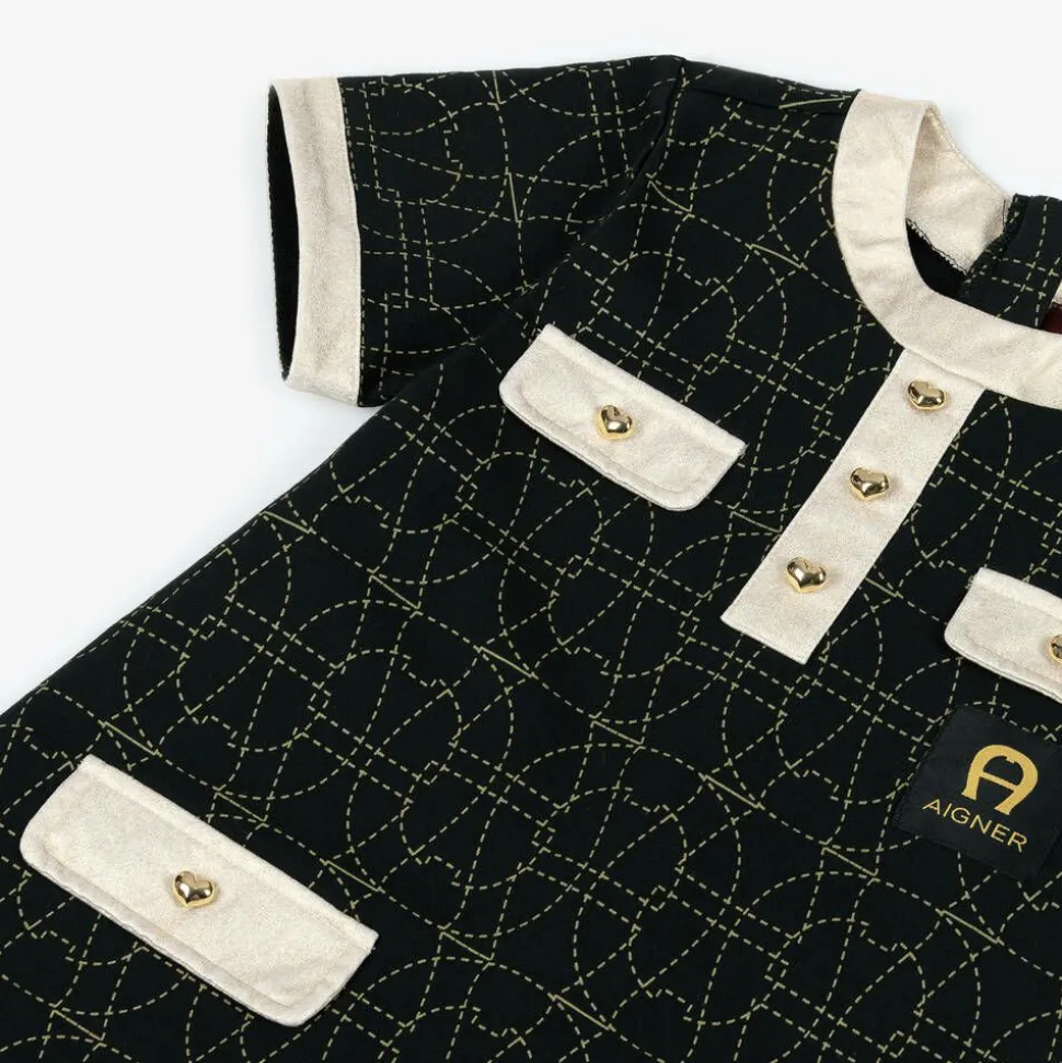Black with shimmery gold trims, this smart cotton jersey dress for girls is by AIGNER. It features the designer's signature 'A' horseshoe logo, in the all-over printed pattern and the branded patch on the front. The front has faux pocket and button placket detailing, embellished with pretty gold-tone heart buttons. The back has a concealed zip fastening for a neat finish.