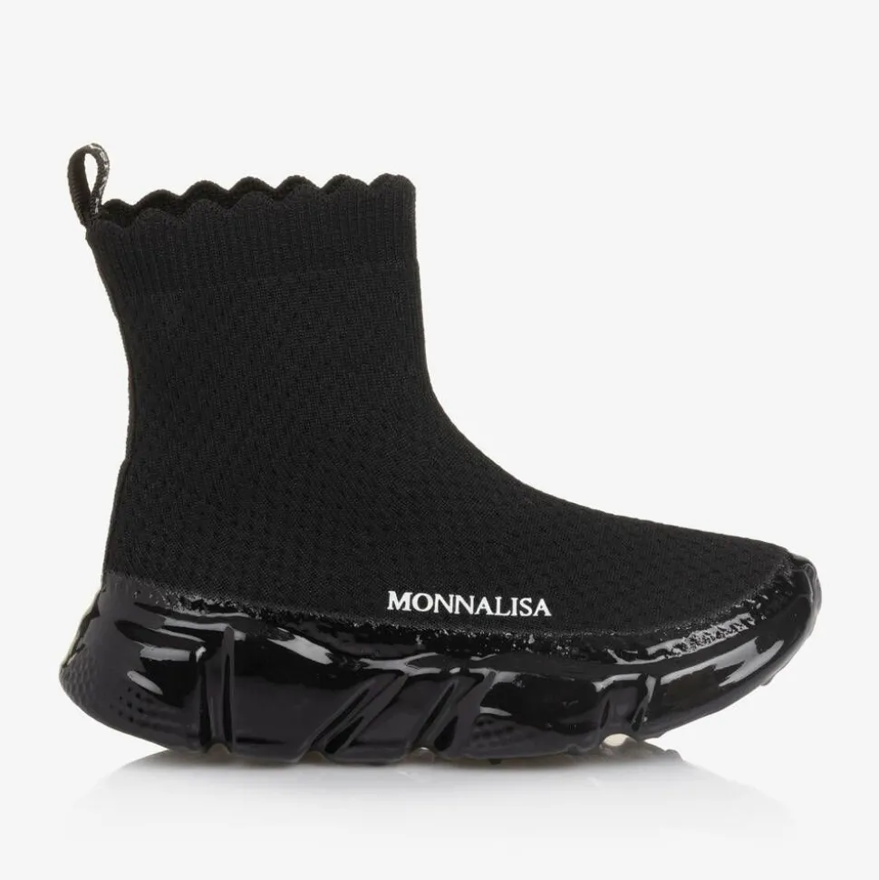 Black sock trainers for girls by Monnalisa, made in soft mesh textile with a scalloped trim. Lightweight and easy to wear, they have a branded pull tab on the back, a white logo print on one side and a cushioned insole for comfort. The non-slip rubber outer sole has a lovely glossy sheen and improves grip on slippery surfaces.
