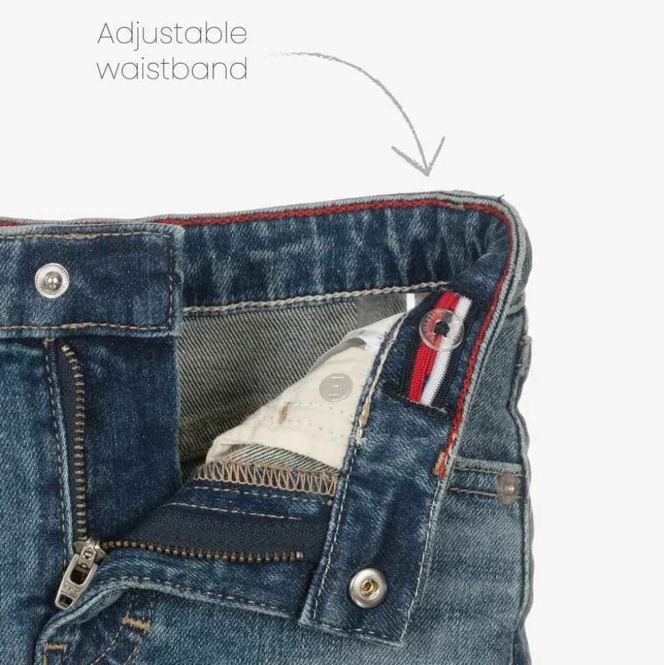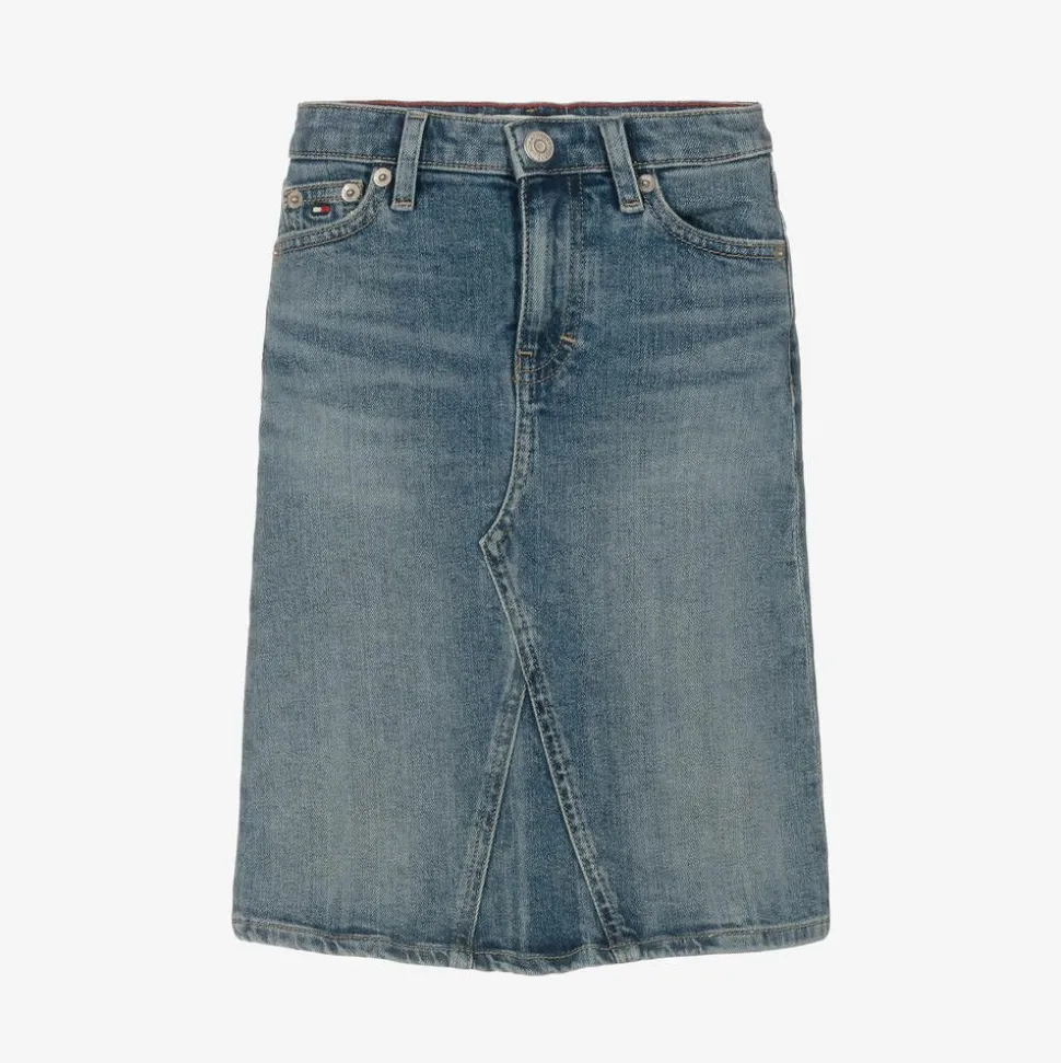 Blue denim skirt for girls by Tommy Hilfiger, with the classic five-pocket style of jeans. Mid-weight and with a slight stretch for comfort, it has an adjustable waist for a great fit. The brand's signature flag logo is embroidered on the front and back.