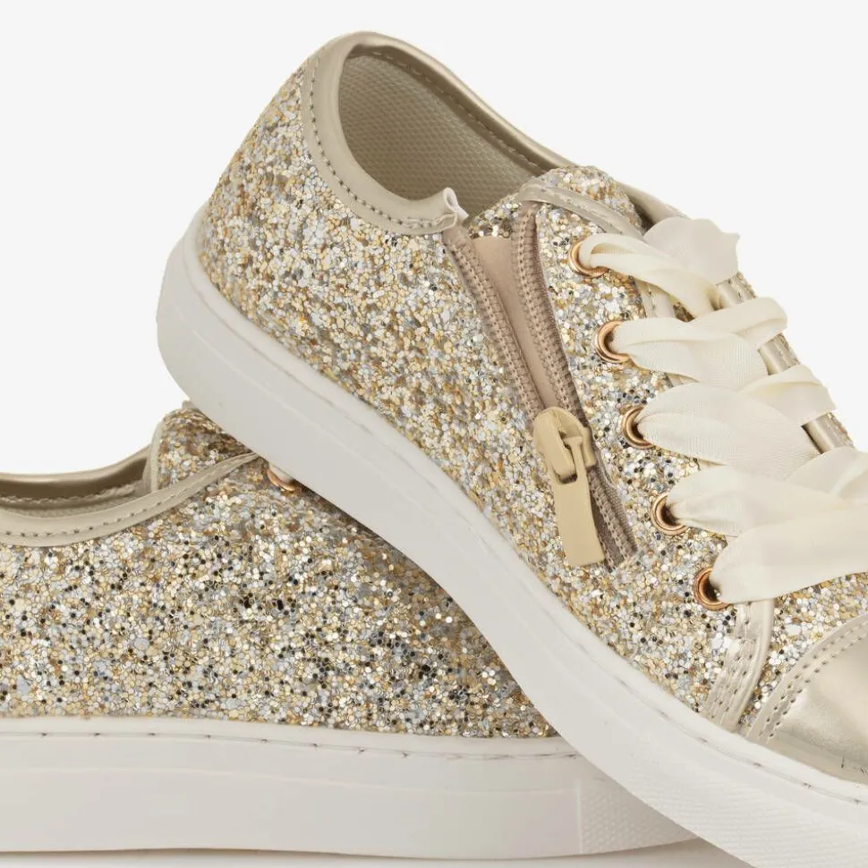 Beautifully sparkly, a pair of gold glitter trainers for girls by Sevva. They have a comfortable mesh lining, a cushioned insole and lovely ivory satin laces, with a side zip fastening for ease. The white flexible sole is textured for good grip.