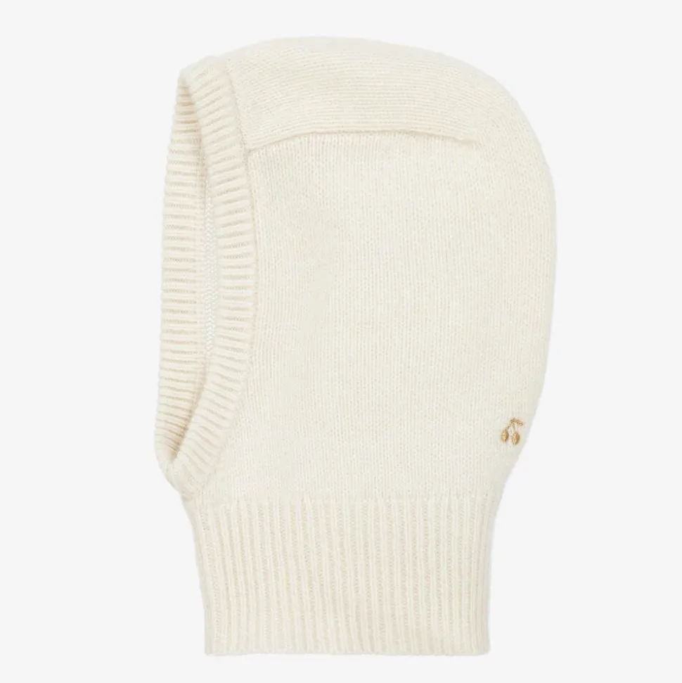 Made in luxurious soft cashmere, this ivory balaclava for little girls is by French couture house Bonpoint. Super soft and warm, it has ribbed trims and the brand's small cherry logo embroidered on one side in gold.