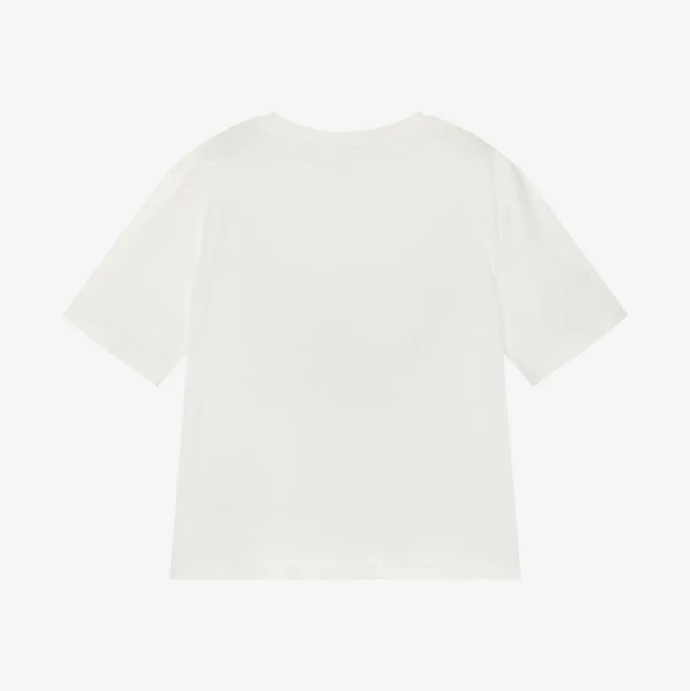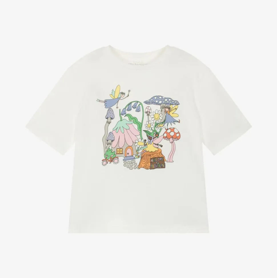 Girls ivory cotton T-shirt by Stella McCartney Kids with a gorgeous fairyland motif printed on the chest. Soft and lightweight, this casual top is made in organic jersey and has dropped shoulders for a more modern look.