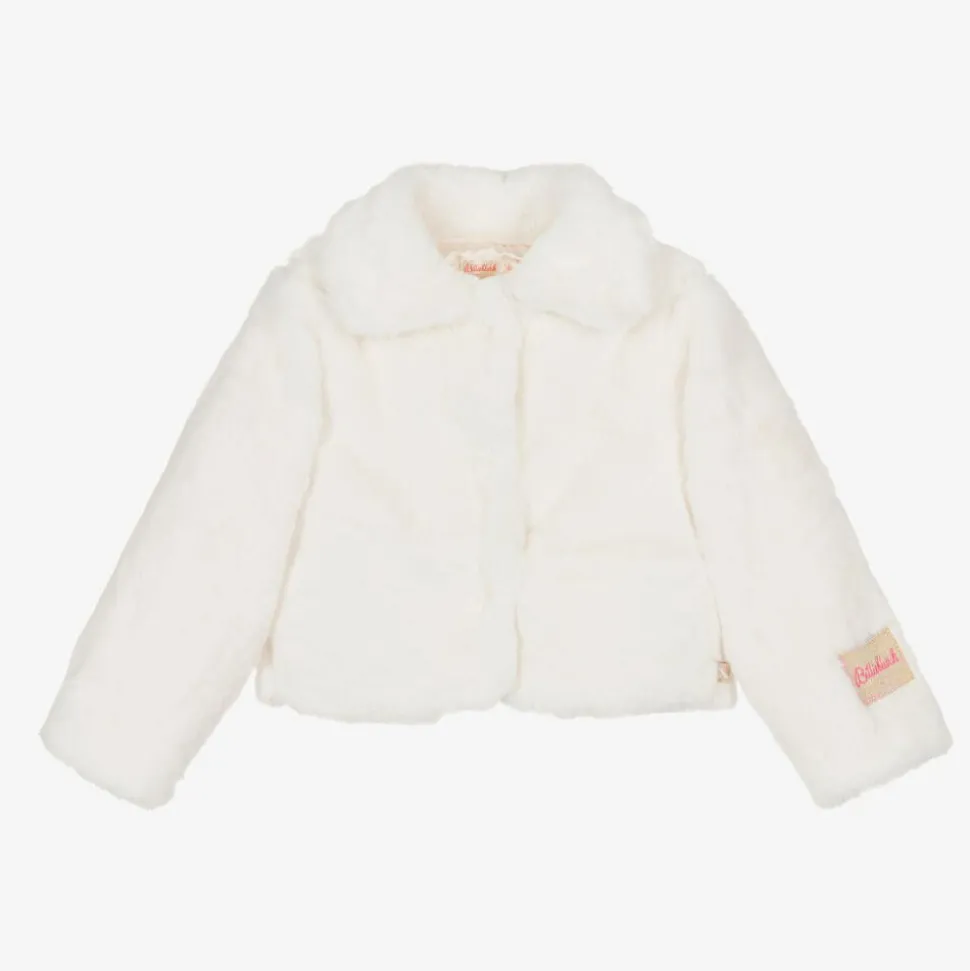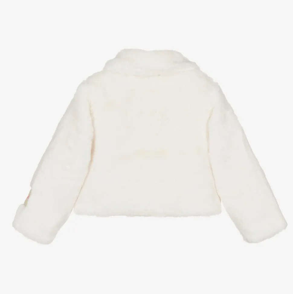 Girls gorgeous ivory faux fur jacket by Billieblush, ideal for special occasions or for making the every day a little less ordinary. Super soft and cosy, it fastens with concealed front poppers and is lined in sumptuous beige satin. It has a logo badge on one sleeve, embroidered in the brand's signature neon pink and trimmed with iridescent sequins.