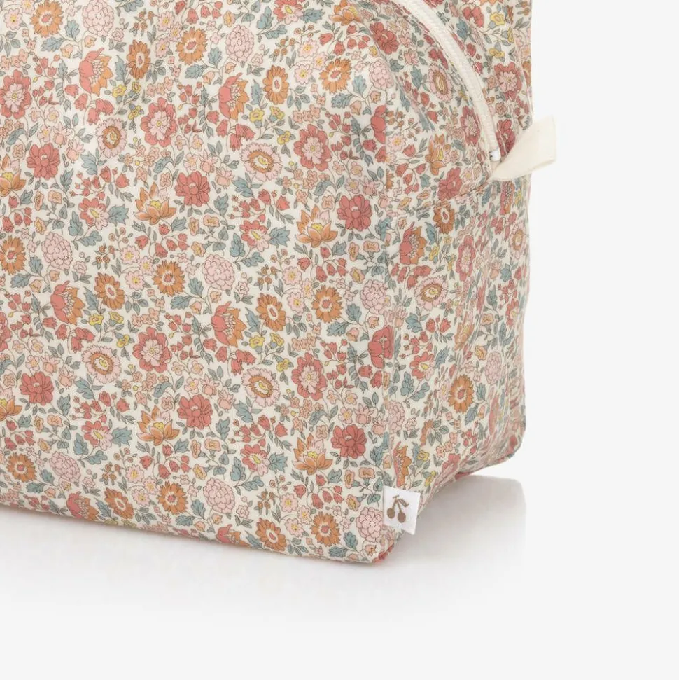 A charming ivory wash bag for girls by Bonpoint, with a dainty pink floral print. This cotton pouch has a smooth coating for easy cleaning and protection. The spacious compartment fastens securely with a zip and the brand's signature cherry logo is featured on a small side seam tab.