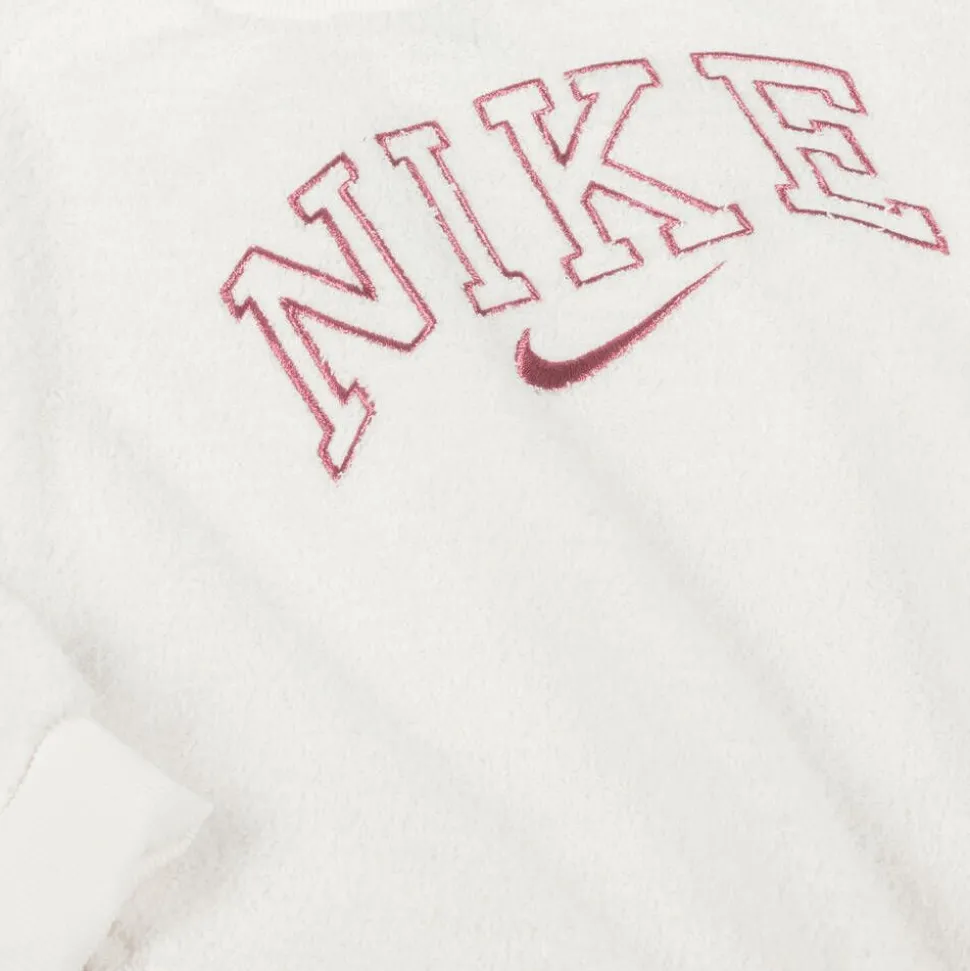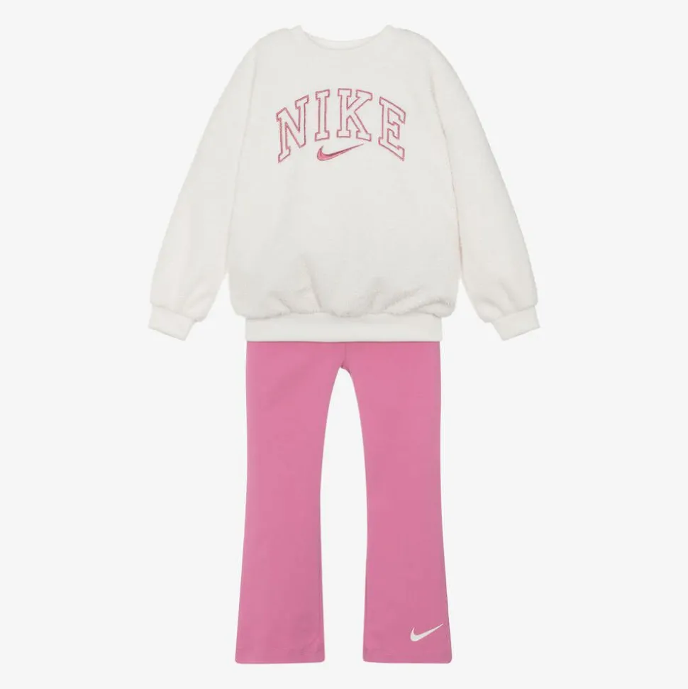 From Nike for girls, an ivory and pink leggings set for a cosy, sporty look. The soft towelling sweatshirt has a large shimmering embroidered logo, whilst the comfortable leggings are finished with the iconic Swoosh logo for brand recognition.
