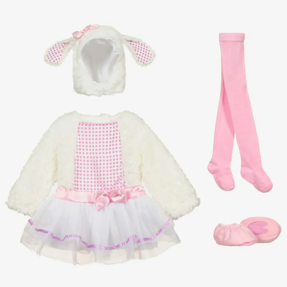 Adorable 'Little Lamb' dress-up costume for little girls from Dress Up by Design. The white and pink dress is made in lamb-effect faux fur with a silky checked panel and satin ribbon trim on the waistline. The glittery tulle skirt has a lilac ribbon trim and the dress fastens with velcro on the back. It comes with a cute velcro-fastening hood with little ears, pink tights and booties.