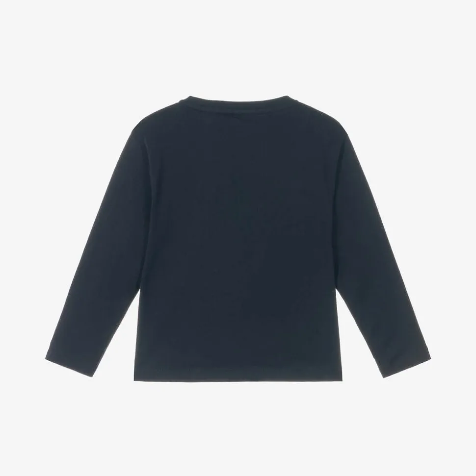 Navy blue top for girls by Name It, with a tea cup full of festive cheer printed on the front. It is made in a comfortable, organic cotton-blend jersey.