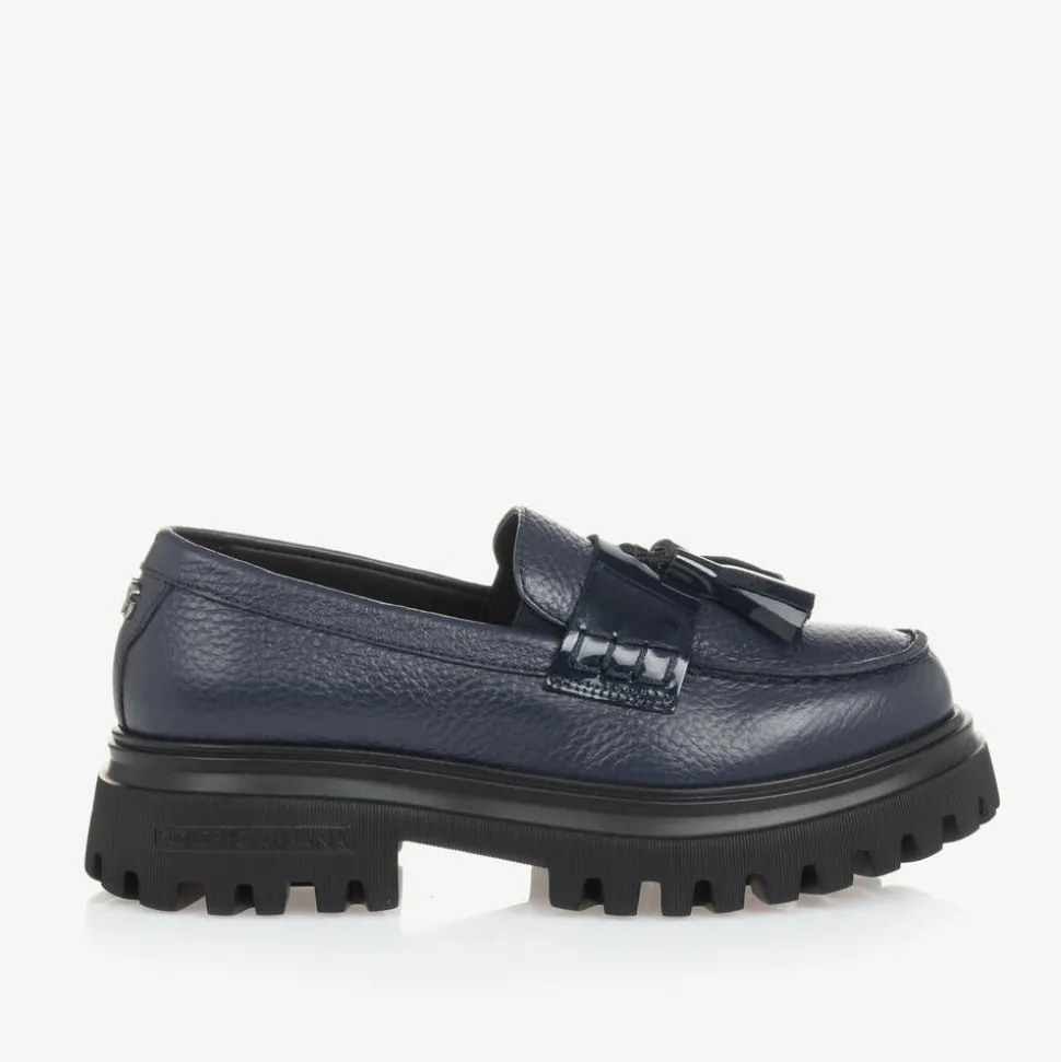Navy blue slip-on loafers for girls by Dolce & Gabbana, with a silver-tone DG logo appliqué on the back. The upper is made in grained leather and styled with patent tassel details. Their thoughtful construction, complete with a leather lining and ultra-lightweight sole, ensures lasting comfort and wearability. The designer's name signed on the chunky sole completes the stylish look.