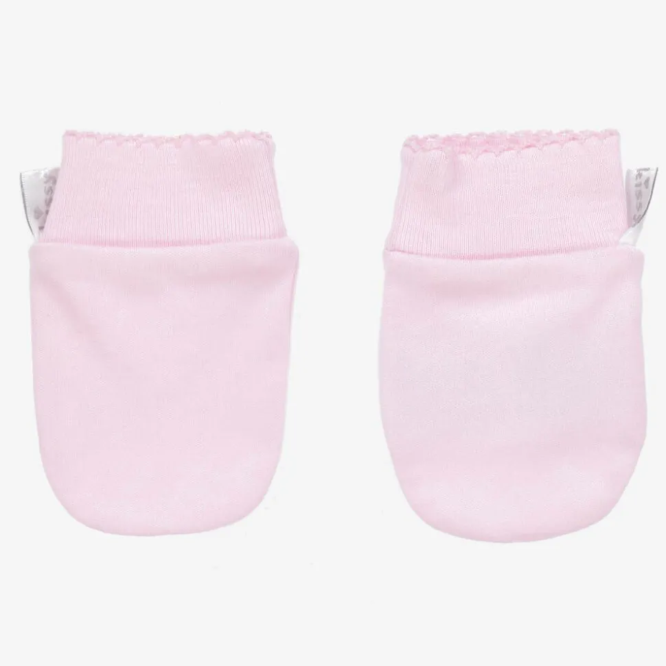 Sweet pale pink scratch mittens for baby girls by Kissy Kissy, made from soft Pima cotton jersey. Comfortable to wear, they have finely ribbed cuffs with lovely picot trims, and are embroidered with a cute teddy bear face on the front.