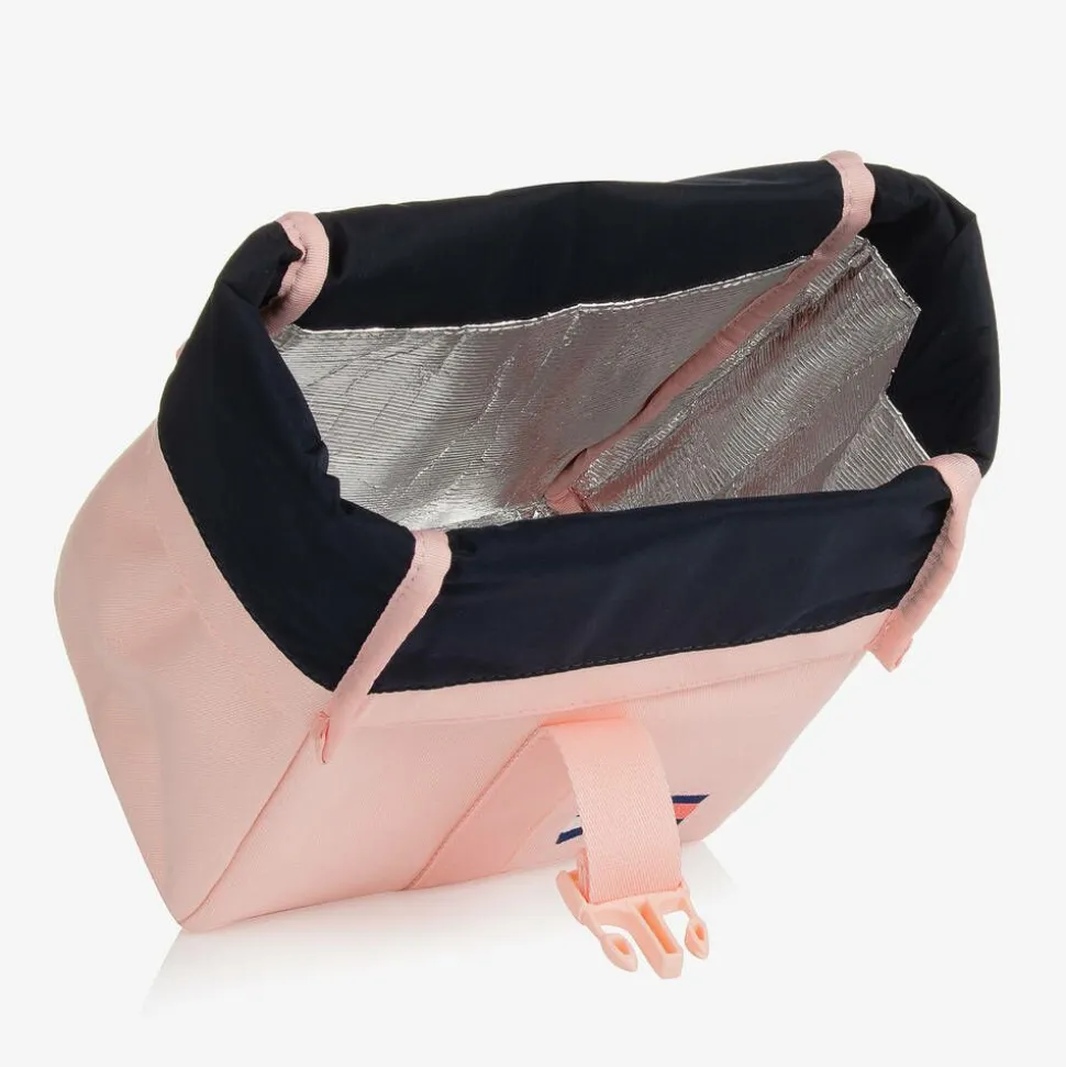 Pink lunch bag for girls by Tommy Hilfiger, made with recycled materials. Designed with the brand's signature flag logo embroidery, it has a spacious inner compartment with a silver foil lining for insulation. The bag fastens with an easy-to-use clip buckle. It can be carried using the detachable, adjustable shoulder strap or by the top handle.
