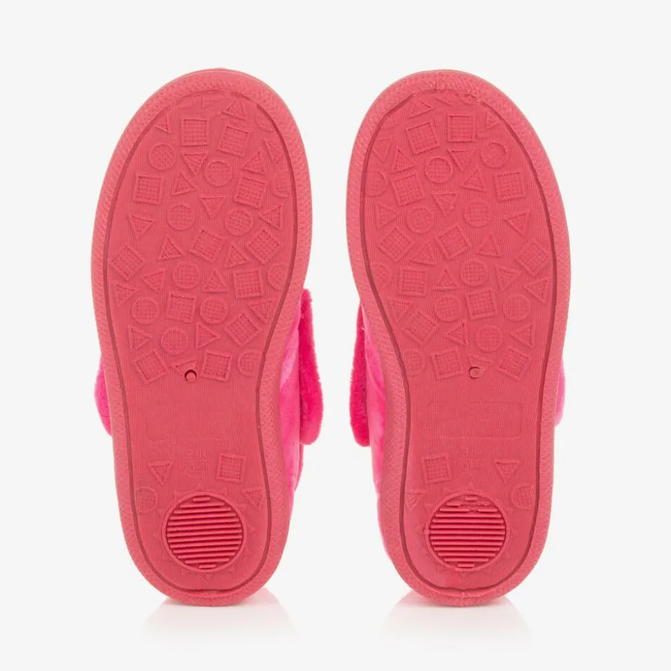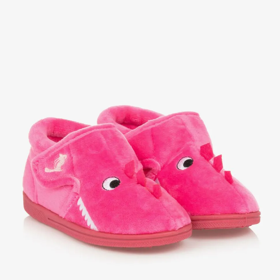 Neon pink slippers for girls by Chipmunks, made and lined in plush fleece for cosiness. Cute and fun, they have a dinosaur design with 3D spines embroidered on the front. The padded insoles provide support, the velcro panels make the shoes easy to put on, and the rubberised soles are flexible and treaded for safety.
