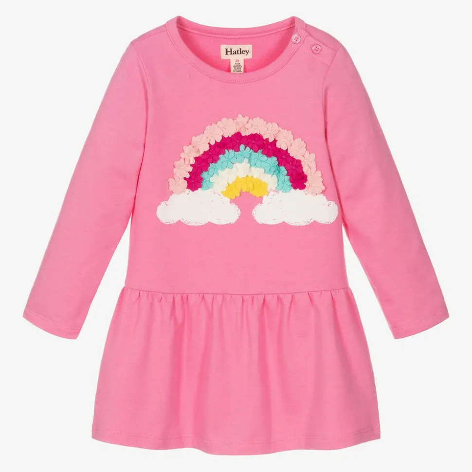 So cute for younger girls, this pink long-sleeved dress by Canadian brand Hatley. It is made in soft and comfortable cotton jersey with a dropped waist and button fastenings on one shoulder. There is a super cute rainbow motif on the front, appliquéd with little flowers and white cloud prints.