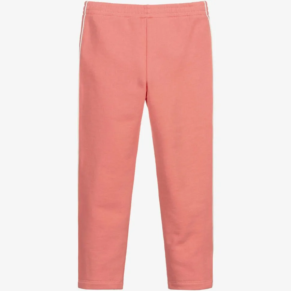 Pink joggers for girls by luxury Italian brand Gucci, made in soft cotton sweatshirt jersey. They have a white Interlocking G logo on the hip, white piping trims and popper fastenings at the ankles. There is a comfortable elasticated waistband.