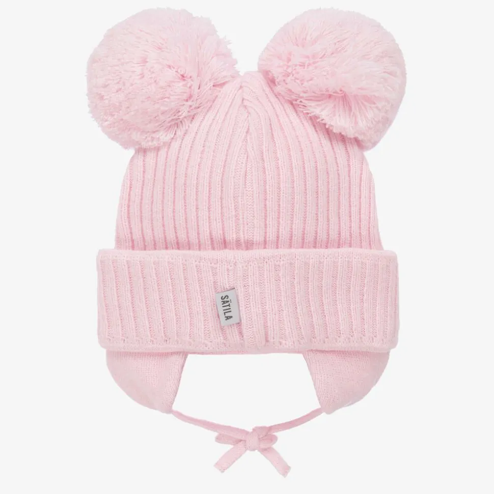 A delightful pale pink winter hat for little girls by Sätila of Sweden. Sweetly styled, it has two cute pom-poms on top, a turned-up brim, and ear flaps with ties that fasten under the chin. Made from a stretchy ribbed knit, it is partially lined in knitted cotton for extra comfort.