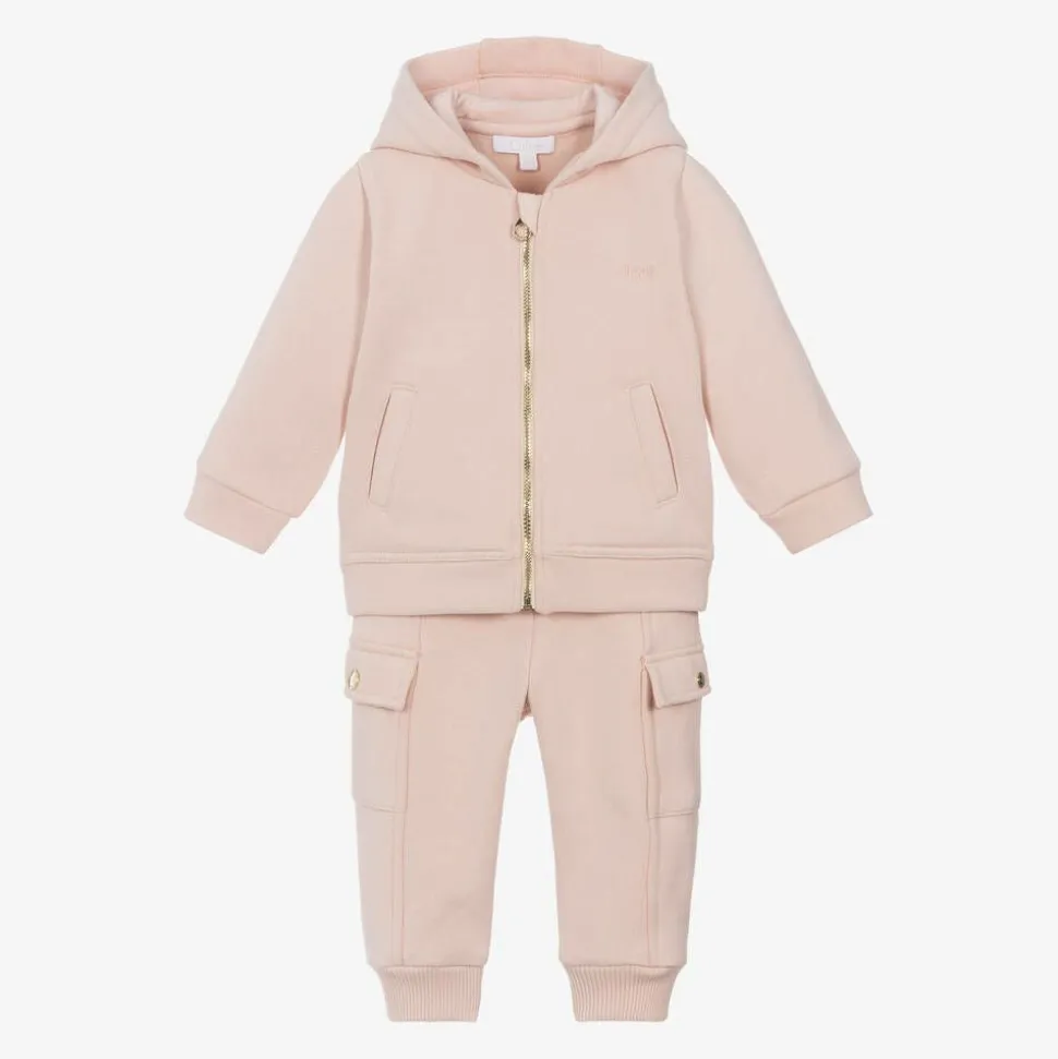 A casual pale pink tracksuit for younger girls by luxury French label ChloƩ, made from soft organic cotton jersey with a warm, fleecy inside. The hooded top has pockets on the front and an exposed gold zip fastening. Completing the relaxed look, the matching cuffed joggers have a fixed drawstring tie on the elasticated waistband and cargo-style pockets that secure with shiny gold branded poppers. Both pieces feature tonal logo embroidery for a discreet designer finish.