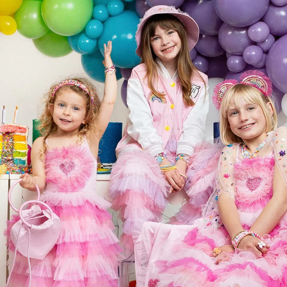 Dark pink hairband for girls by Tutu du Monde, designed in collaboration with Flour Shop by Amirah Kassem. This eye-catching hair accessory is covered with rainbow beads for a colourful and sparkly finish. It is lightly padded for extra height.