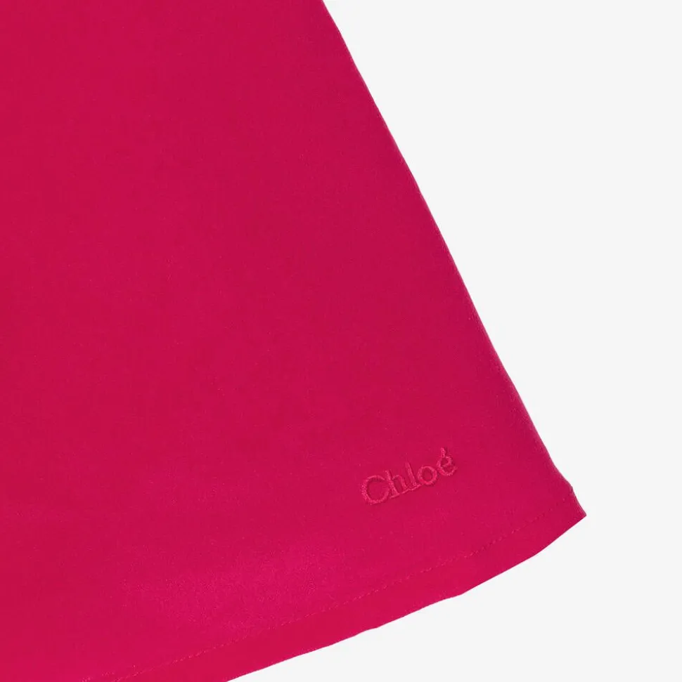 Beautiful magenta pink dress for girls by luxury French designer, ChloƩ. Exquisitely made in silk, this floaty dress has a sophisticated high neckline and shirred, fluted cuffs. Delicate guipure lace features across the bodice, showcasing fine craftsmanship and detail. The soft cotton lining ensures comfort during wear and the concealed zip on the back fastens the style effortlessly.