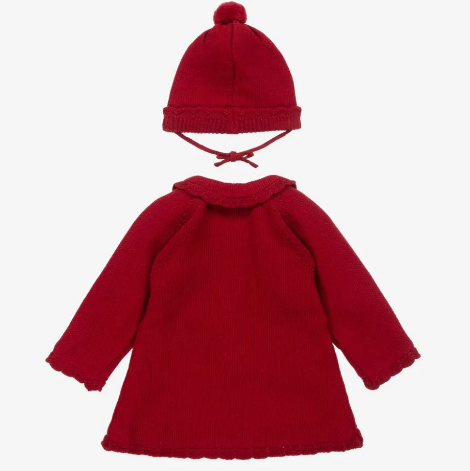 Girls Red Knitted Pram Coat & Hat Set