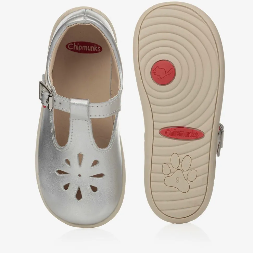 Shiny silver bar shoes for girls by Chipmunks, made in beautifully soft leather. Decorated with classic flower punch detailing on the toes, these cute shoes have a comfortable faux leather insole and an easy-to-use buckle fastening strap across the foot. The beige, non-slip rubber outer sole provides excellent grip.