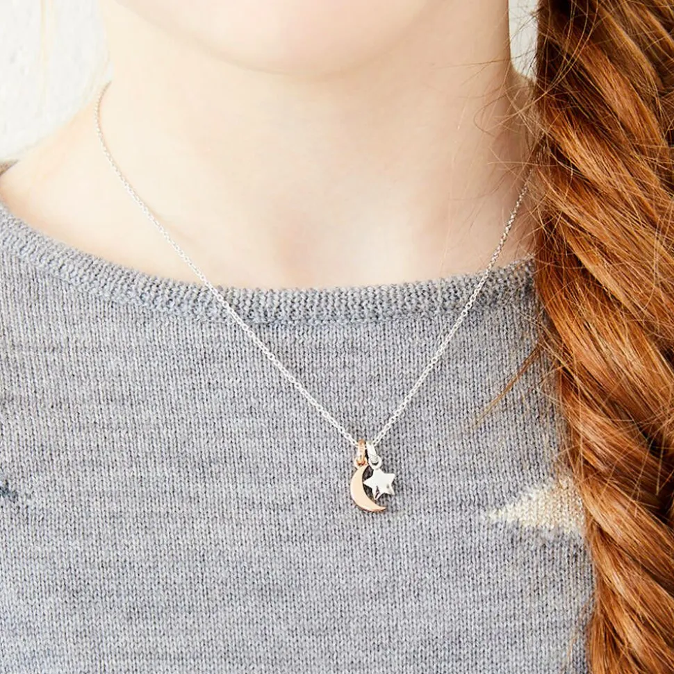 A beautiful sterling silver necklace for girls by Little Star, with a rose gold plated moon and silver star charms. This timeless and understated jewellery piece is lovely for any occasion, with an adjustable, clasp-fastening silver chain. Presented in a drawstring pouch with a Little Star gift box and bag, it makes a precious gift to celebrate that special moment and for your little ones to keep and cherish.