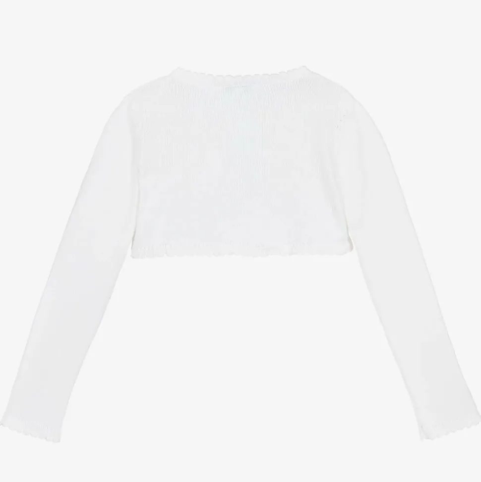 Lovely white long-sleeved bolero cardigan for girls from classic British brand Beatrice & George, exclusive to Childrensalon. Knitted in beautifully soft cotton for comfort, this timeless style is shaped at the front with a single button fastening and a pretty scalloped trim.
