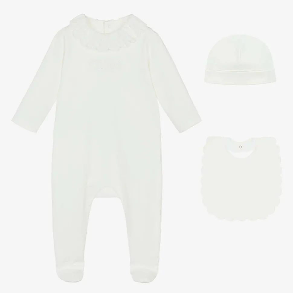 A delightful white babysuit set for girls by luxury French designer ChloƩ, made in soft organic cotton jersey. A lovely gift for a special little one, it comes beautifully presented in a branded box. The classically styled babygrow has a charming ruffle collar and popper fastenings on the back for easy dressing. It comes with a matching hat with a cute turn-up brim and a useful bib, with a scalloped edge and soft towelling lining. All pieces have delicate floral and logo embroidery in tonal thread for a subtle designer touch.