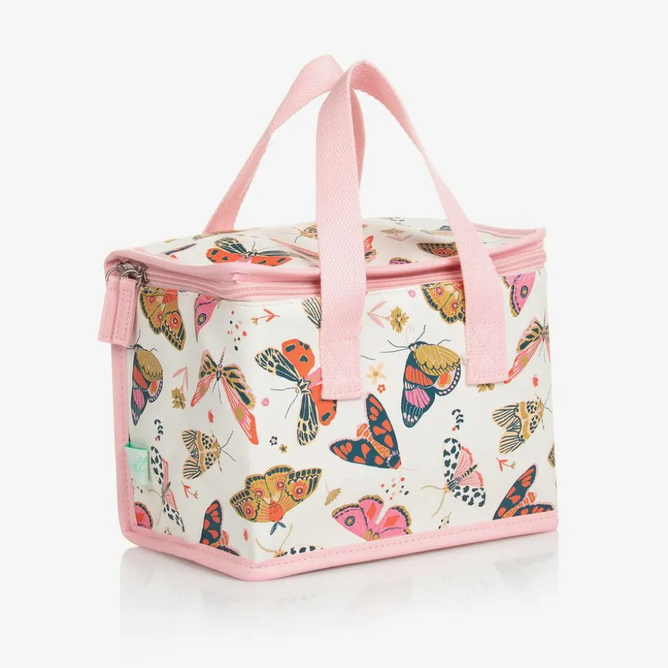 Cute white and pink butterfly lunch bag for little girls, by Powell Craft. It has one main zipped compartment with silver insulation and zip fastening around the top.