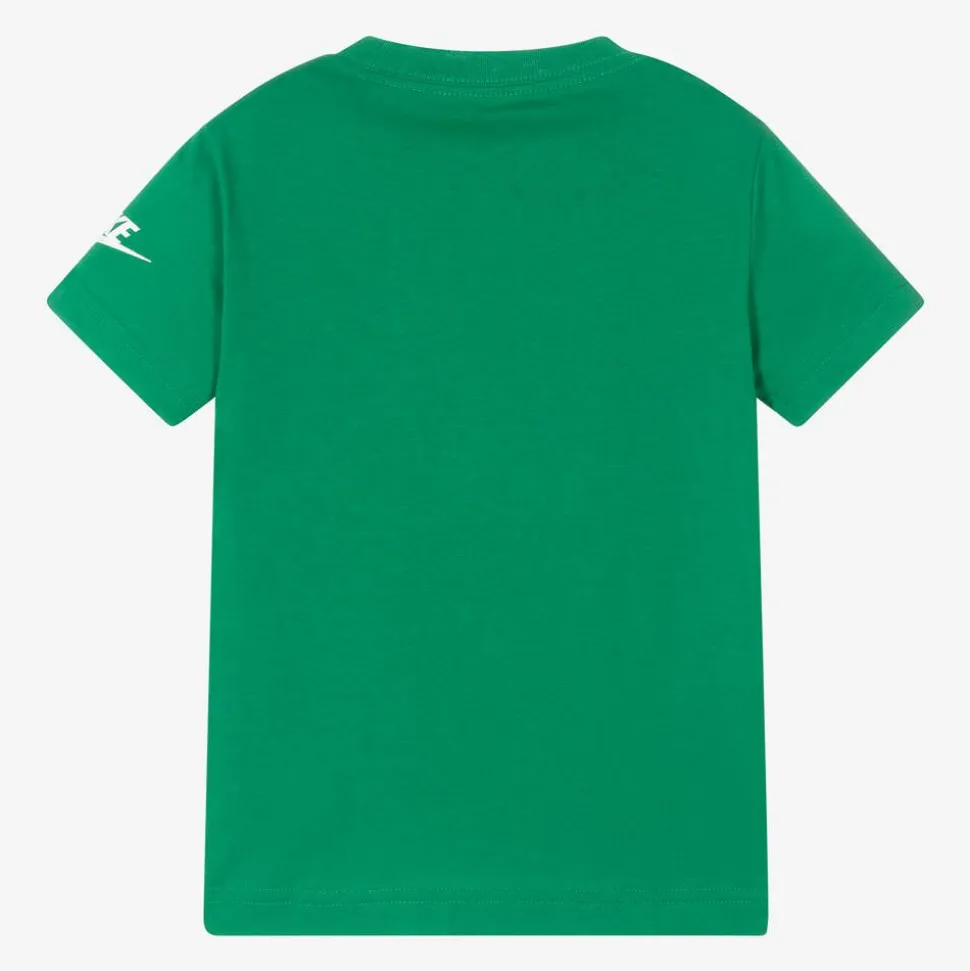 Bright green T-shirt for boys and girls by Nike, made from a soft and lightweight cotton blend jersey for added comfort. Printed with a large white logo on the front and sleeve for instant brand recognition, this casual top has short sleeves and a crew neckline.