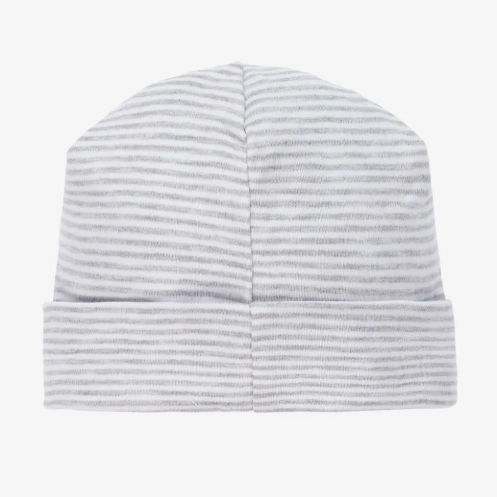 A sweet grey and white striped hat for baby boys and girls from Kissy Kissy. Made in a double layer of the softest Pima cotton jersey, with a turned up brim.