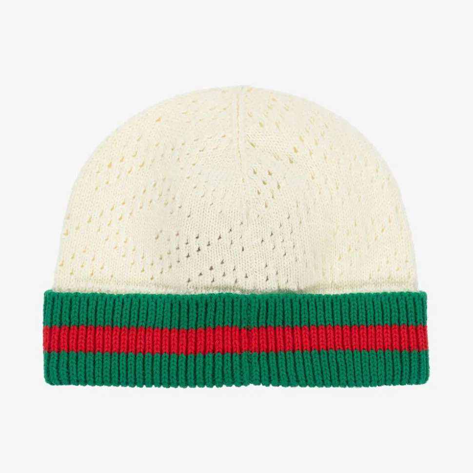 Ivory beanie hat for baby boys and girls from luxury Italian label Gucci, knitted in comfortable, breathable cotton. For unmistakable designer style, the Gucci monogram logo is reimagined as a perforated pattern on the crown. Completing the look, the ribbed brim displays the signature green and red Web stripes.