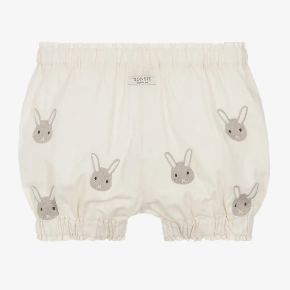 Adorable ivory shorts for little boys and girls by Dutch designer, Donsje. Embroidered with adorable grey bunny rabbits, these cute bubble shorts are made in soft and breathable organic cotton poplin. With little one's comfort in mind, they have an elasticated waist and leg holes. The brand's logo label is stitched on the back to complete the look.