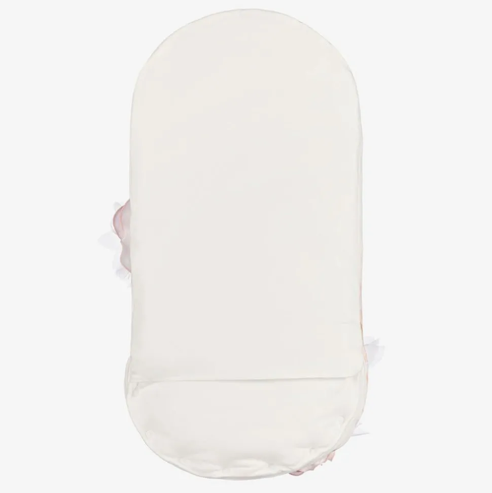 Lovely for a baby girl, this ivory and pink nest by Sofija is exclusive to Childrensalon. Made from soft cotton jersey, this lightly padded nest has a beautiful peacock print on the front with ruffled tulle and diamanté trims. A pretty pink 3D flower adds an extra special touch. The nest has a velcro opening and easy popper fastenings around the base. A removable coir mat allows for a firmer base if required.