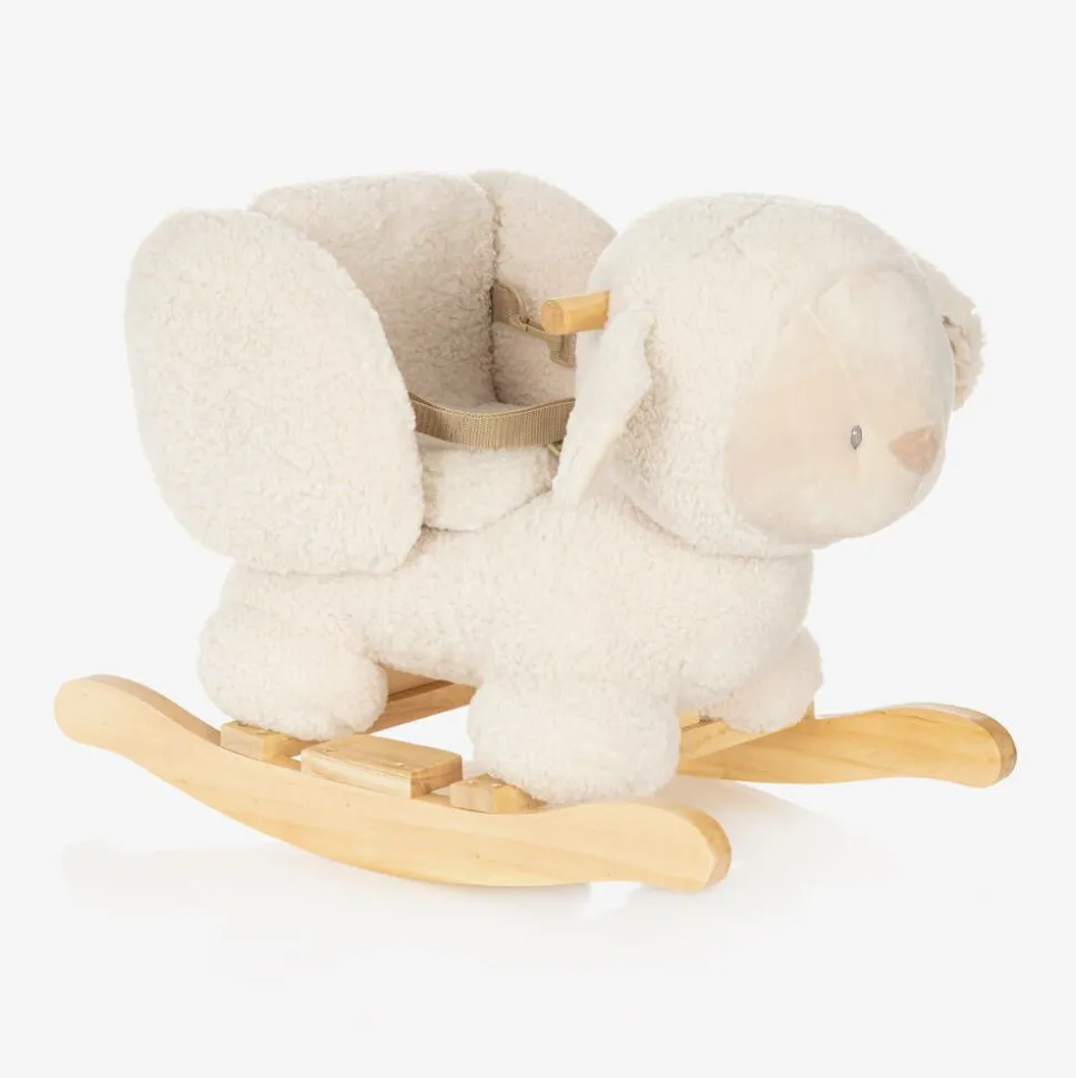 Adorable ivory sheep rocking toy for little boys and girls by Nattou, lovely as a gift. Made in beautifully soft teddy fleece, the charming sheep character has floppy ears, a plush nose and embroidered eyes. Helping to promote your child's sense of balance, this toy has been specially designed for safe rocking. It has a wide wooden base for stability, with footrests, a safety belt, a softly padded seat with side supports, and useful handles for tiny hands to hold onto. The safety belt allows for a secure ride.