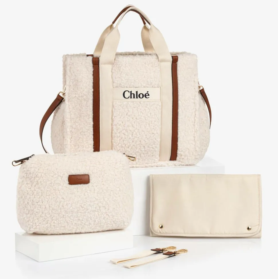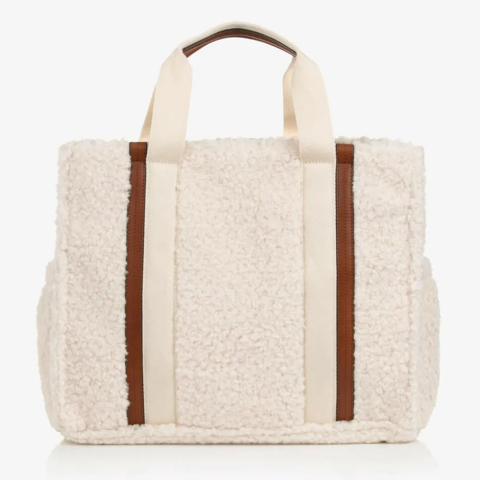 Exclusive to Childrensalon, an ivory changing bag by luxury French designer ChloĆ©, made in super soft sherpa fleece with tan brown leather trims. With ivory twill handles and gold-toned hardware, this practical accessory is refined with the brand's signature black logo printed on the front slip pocket. It has a large main compartment, multiple pockets, and a detachable zip pouch inside for organising essentials further. As well as a foldable changing mat, this multi-purpose bag has a detachable leather shoulder strap and two woven buggy straps. This product is made with recycled polyester.